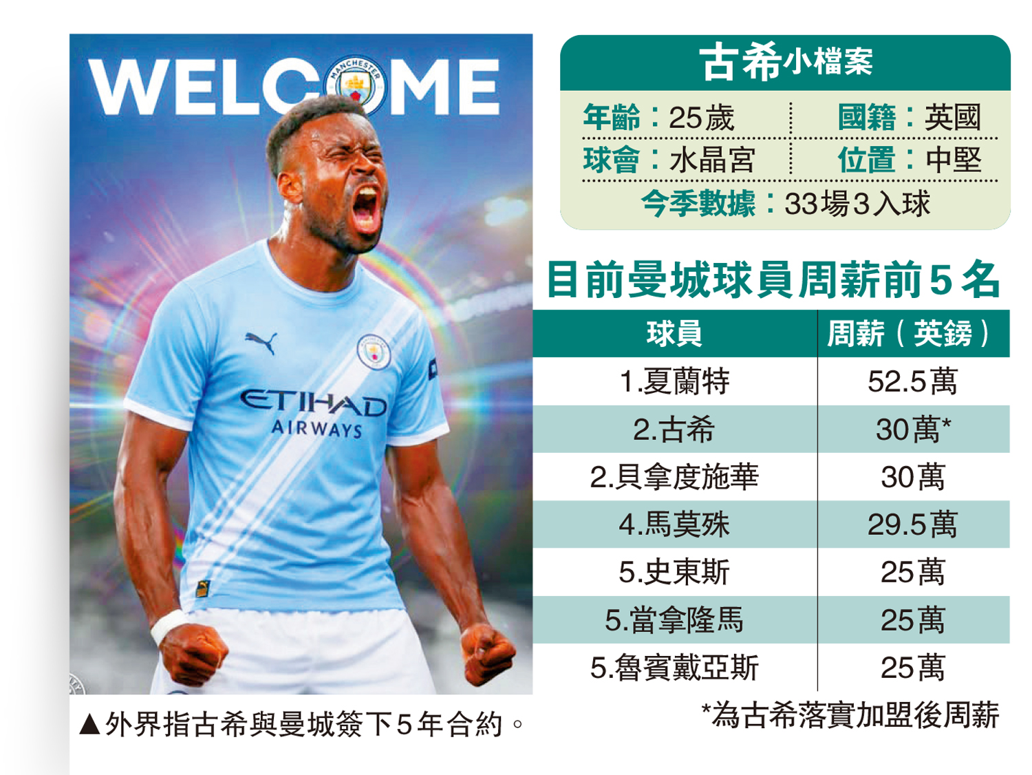 英格蘭中堅馬克古希爭奪戰接近落幕,英超勁旅曼城以「超抵價」2000萬英鎊(約2億港元)轉會費向水晶宮提出收購,後者接納報價,古希即將接受體測,如無意外他將與曼城簽下5年合約,並獲得30萬英鎊(約300萬港元),使他與貝拿度施華並列隊內第二高薪球員,並僅次於射手艾寧夏蘭特。