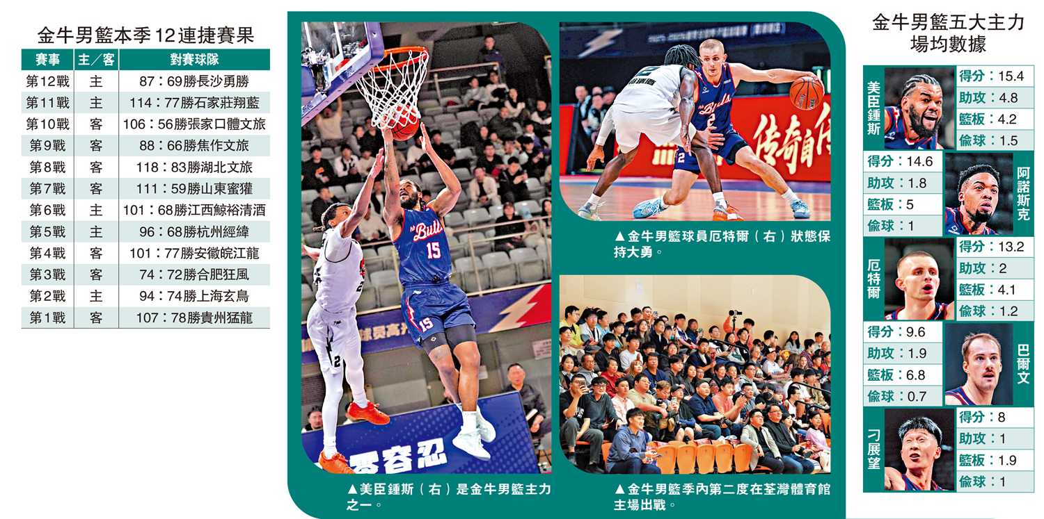 不過,金牛在硬仗中所展現的防守水準、外援的關鍵球處理水平仍是領跑聯賽,且在下半場往往能迅速站穩陣腳,憑着一輪「小高潮」鎖定勝局,當中少不了美臣鍾斯、阿諾斯克、厄特爾等球隊主力的功勞,上述3位球員皆投出超過50%的整體命中率,時常在「強強對話」時扮演關鍵角色。另兩位主力巴爾文、刁展望則為球隊提供火力及防守支持,使得金牛攻守十分平衡,至今仍保持全勝佳績。