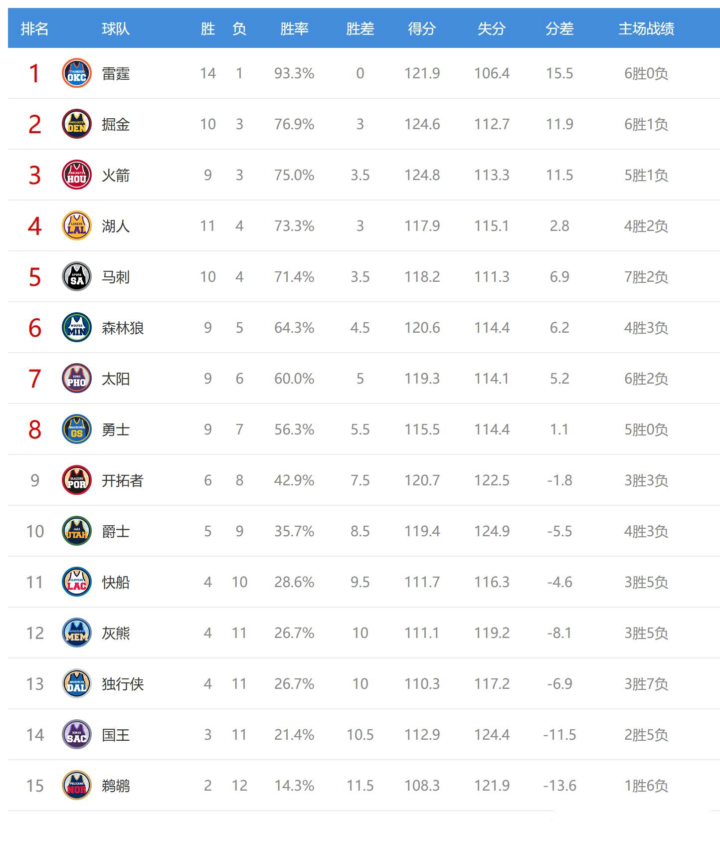 今日比赛后太阳、勇士排名互换,快船、灰熊排名互换,其他球队排名不变。