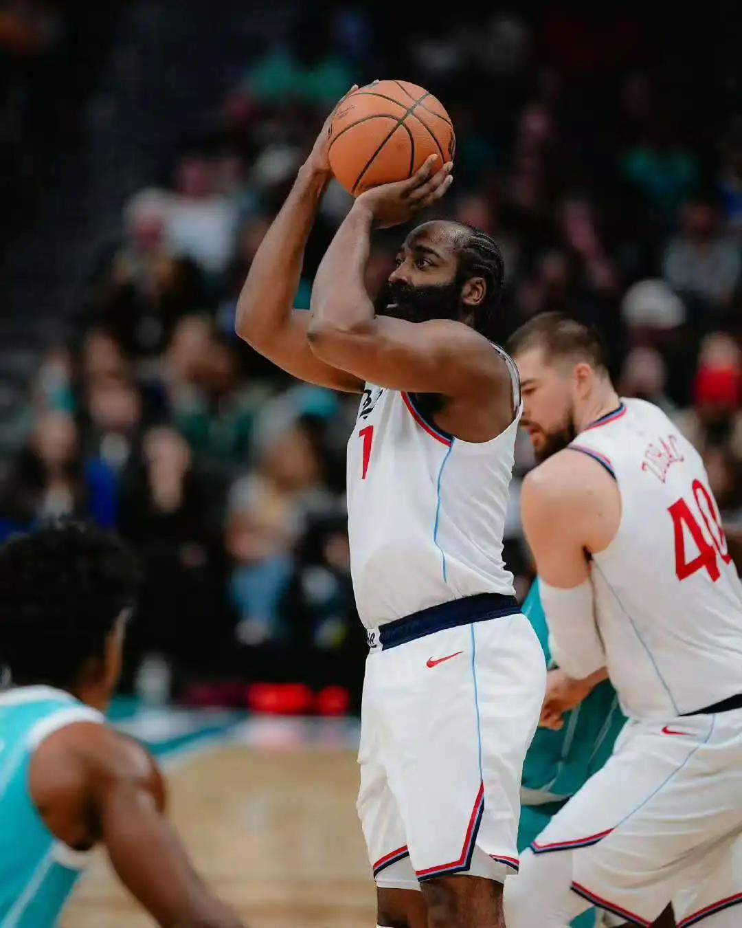 哈登,首节27分全场55+7+10记三分,创快船队史单场得分纪录。