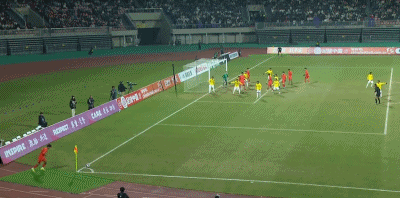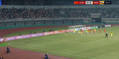 第90+4分钟,对手门将送禁区内间接任意球,中国队多次射门被封堵